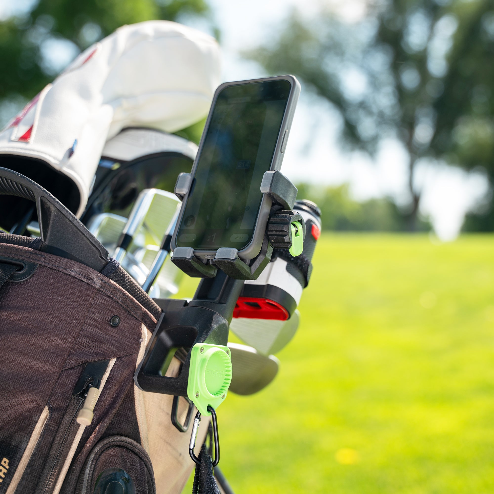 The compact mounting base stays clipped to your bag, while the phone holder stores neatly between rounds. When you’re ready to play, simply click it into the magnetic QuickLink™ base and you’re set up in seconds.