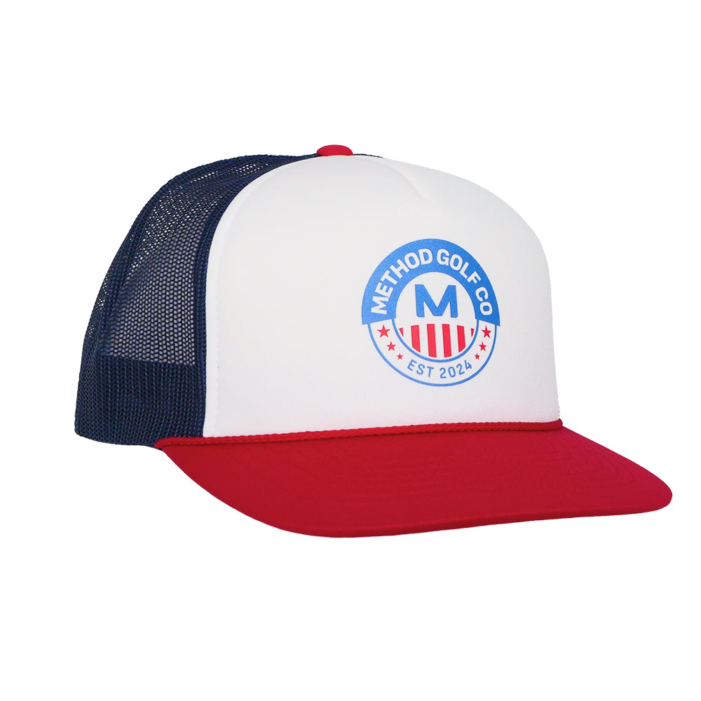 Fly the flag on and off the course with the Method Patriot Hat from Method Golf Co. This hat is all about confidence, performance, and American grit—just like your game. Designed in bold red, white, and blue, it features our signature Method “M” logo heat-transferred front and center. The structured foam front panel delivers a bold look with all-day comfort, while the breathable mesh back keeps your cool intact from the front nine to the 18th hole.
